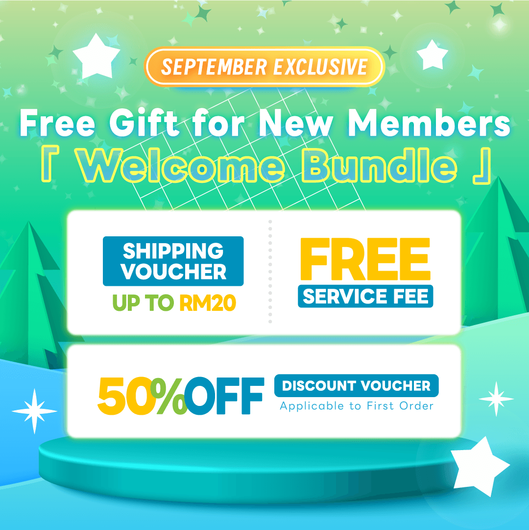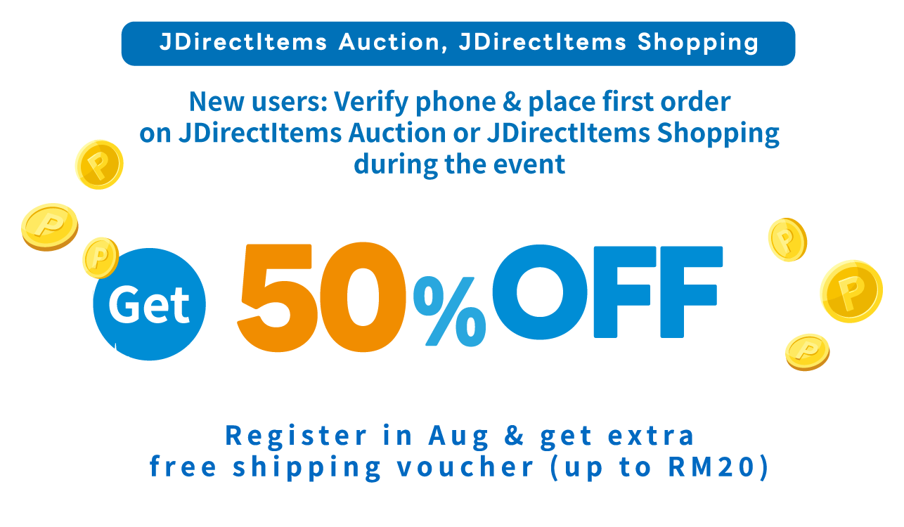 - Upon registering as a member and completing phone verification during the promotion period, your account will receive one "50% OFF Product Discount Coupon" and one "RM20 Free Shipping Coupon".