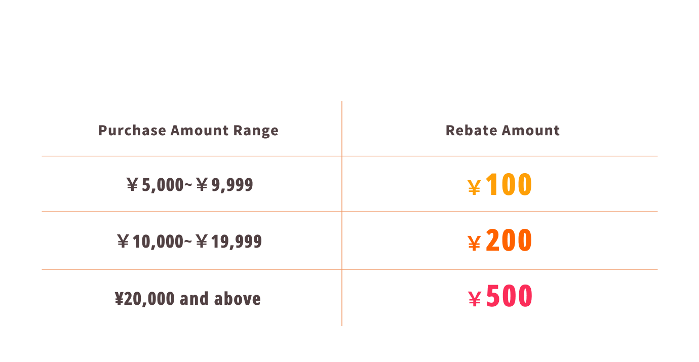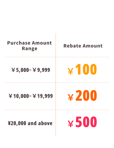 - During the campaign period, purchases through JDirectItems Auction, Japan Proxy Bidding Site with a single order total of: ¥5,000 to ¥9,999 will receive a rebate of ¥100;¥10,000 to ¥19,999 will receive a rebate of ¥200;¥20,000 and above will receive a rebate of ¥500。(Rebate per order capped at ¥500 JPY) (Product discounts are not included in the calculation)