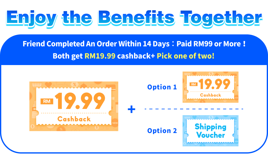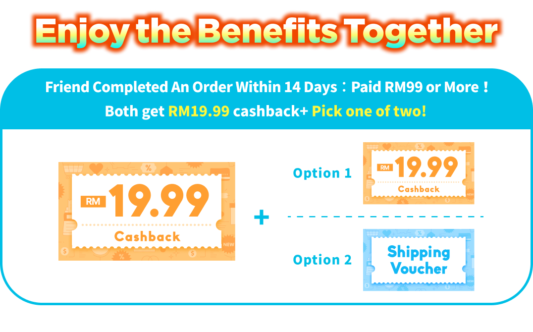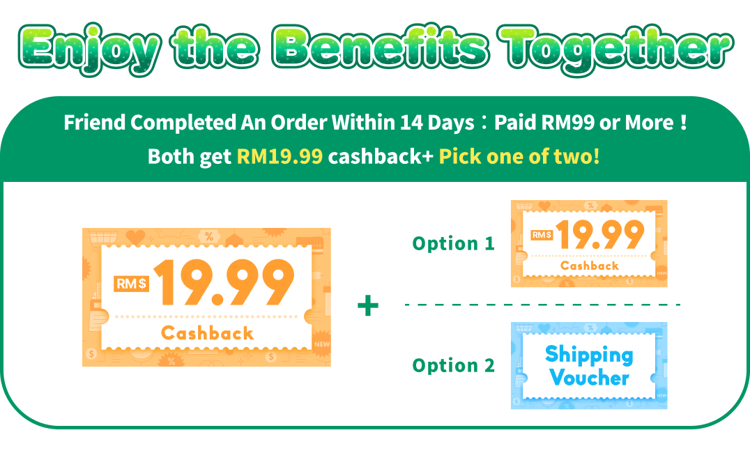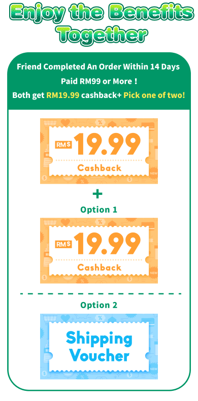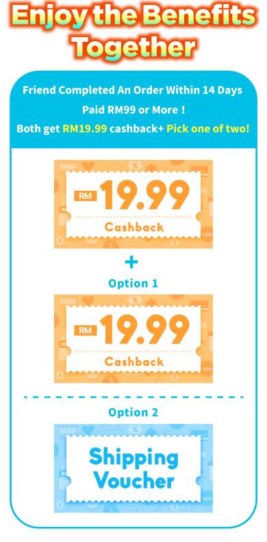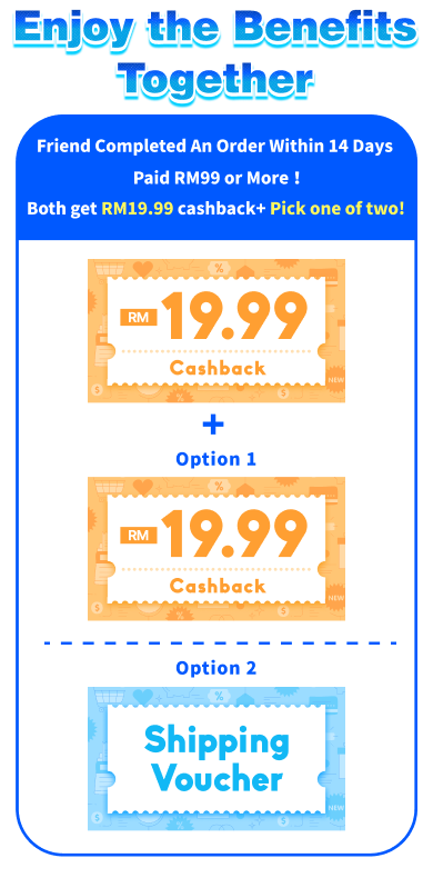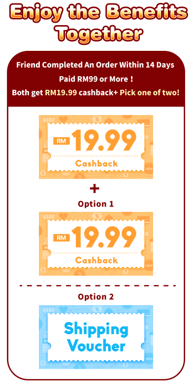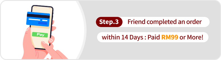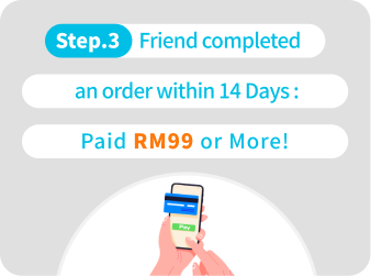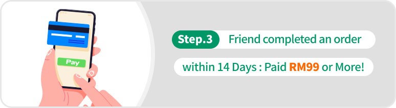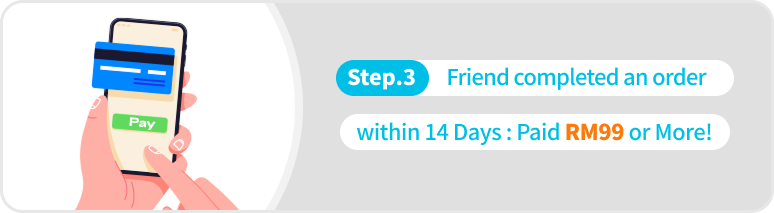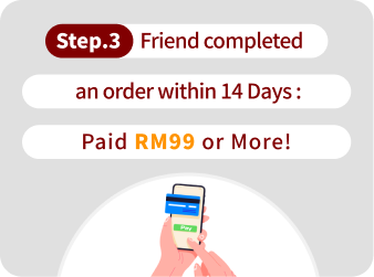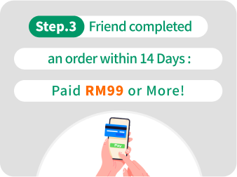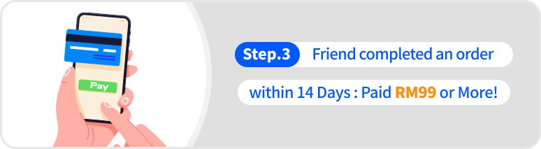 - The referred friend must complete their first payment by the end of the registration month with a minimum spending of RM99. Both you and your friend will qualify for the "Pick Your Reward" program once the friend's first payment is completed. (Rewards will be credited on the 4th day at 12:00 AM after the payment is made.)