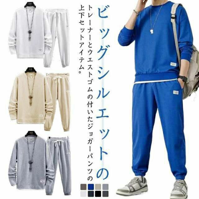 スウェット セットアップ メンズ ジャージ フェイクレイヤード ワッフル 重ね着風 オールシーズン 長袖 無地 薄手 上下 スウェット 長袖パジャマ トップス パンツ パジャマ ルームウェア ブラック グレー ネイビー ベージュ コーヒー ブルー ホワイト