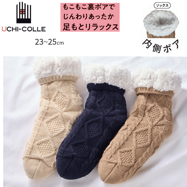 グンゼ ウチコレ 極厚 内側ボア ルームソックス クルー丈 ケーブル柄 23-25 裏ボア GUNZE UCHI-COLLE ルームソックス 極厚 室内履き ボア 冷え対策 在宅 スリッパ 保温 消臭 ホット ヒート 防寒 レディース プレゼント 母の日 敬老の日 秋冬 楽天 通販 AUY643 送料込み