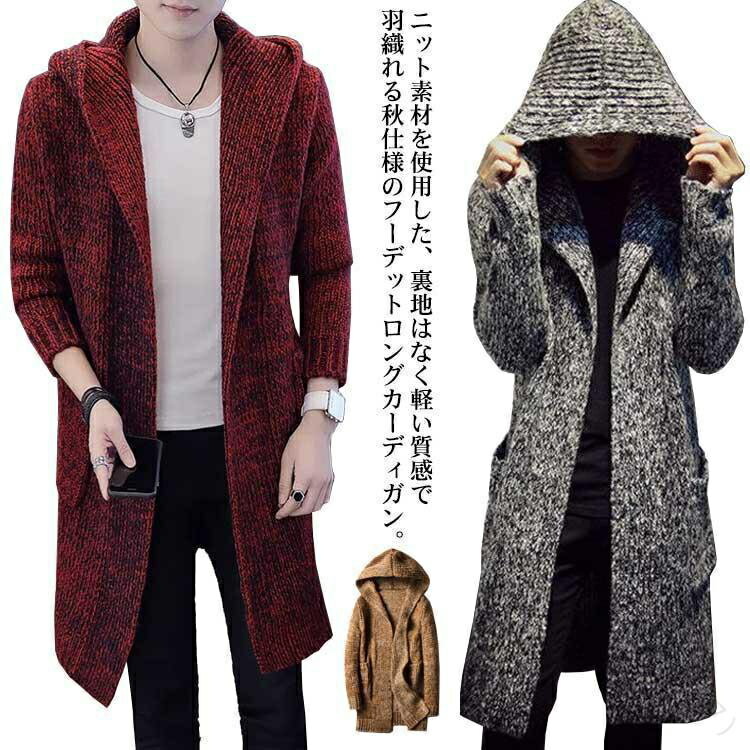 ニットカーディガン ロング フード付き メンズ コーディガン ロングコート ニット 羽織り アウター 厚手 秋物 冬物 ショールカラー ボタンレス しっかり防寒で快適な着心地の男女兼用ファッションアイテム