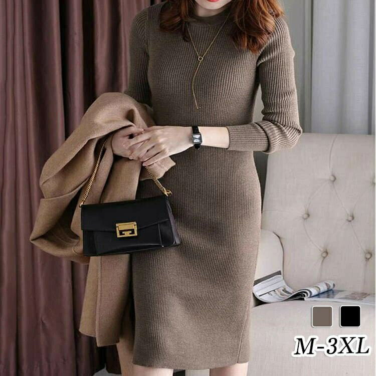 ワンピース レディース ニット 綿 秋 冬 リブニットワンピース ニットワンピ ニットワンピース ロングワンピース 長袖 無地 ミディ丈 ミディアム きれいめ おしゃれ
