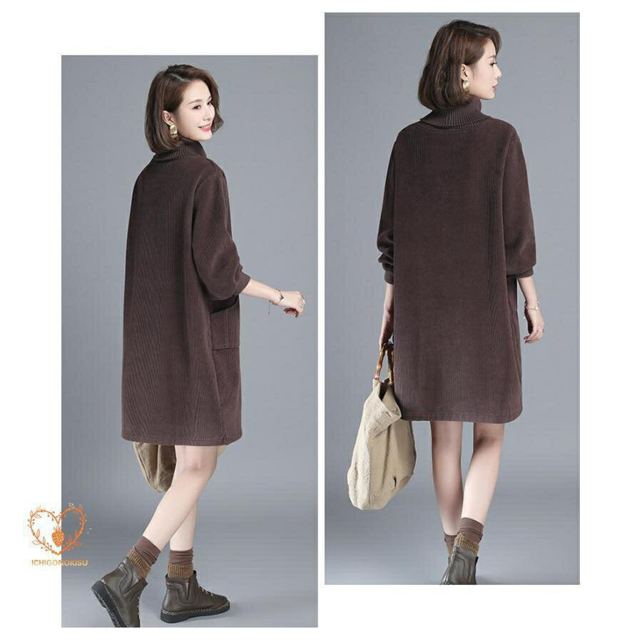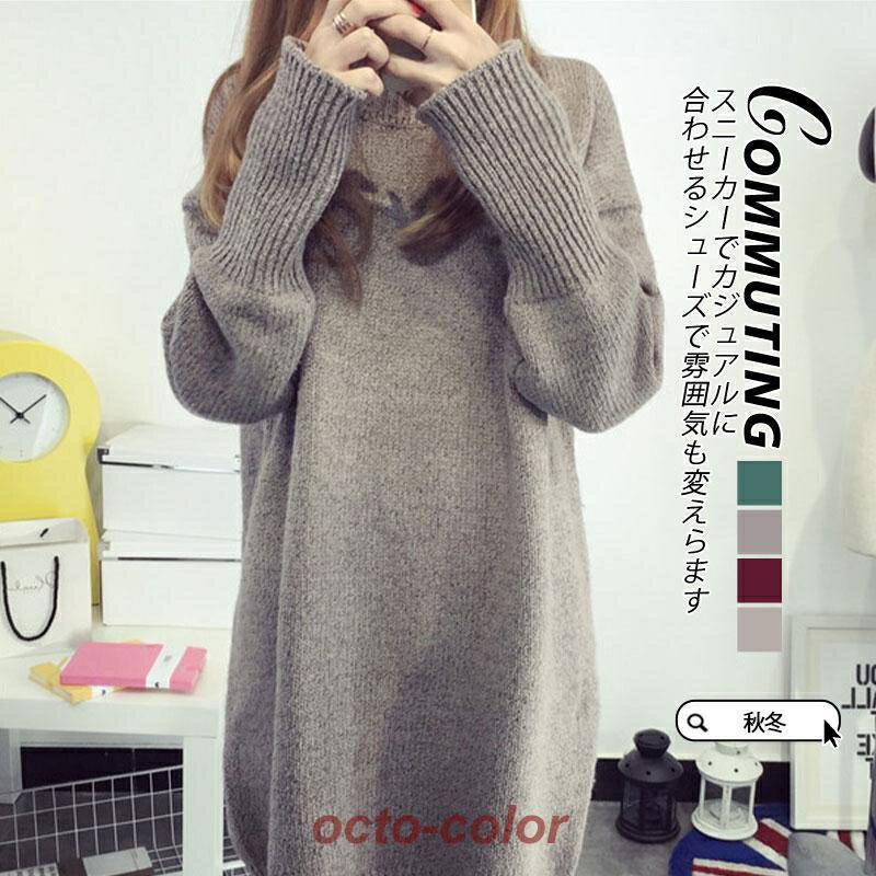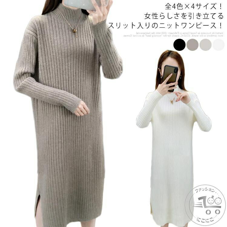 ニットワンピース レディース 秋冬 膝丈 長袖 セーター ワンピース チュニック トップス ハイネック リブ あったかい 防寒 ロングニットワンピ きれいめ