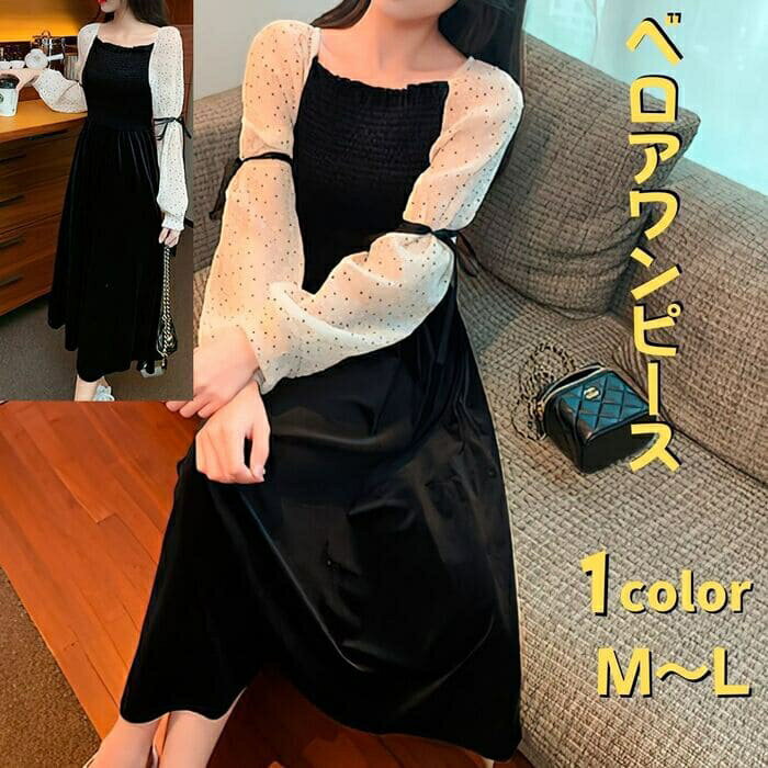 高校生 ファッション ブラック ベロア ワンピース レイヤード風 10代 韓国 おしゃれ 大きいサイズ レディース 秋春 長袖 14194
