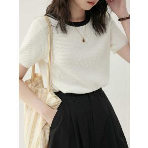 「北島AMUU」 フレンチ ラウンドネック カジュアル 半袖 ニット アイスシルク Tシャツ 女性 夏用 スリム効果 カラーブロック トップス