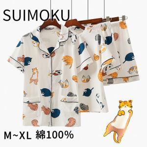 スイモク ネコ柄 パジャマ 綿100% 半袖 ルームウェア セット レディース 上下セット ショートパンツ 部屋着 薄手 柔らかい お肌に優しい きれ