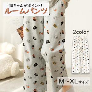 ルームウェア パジャマ パンツ レディース 部屋着 ナイトウエア 薄手 猫 綿 肌に優しい ホワイト グレー生地が柔らかい 5683035 水沐良品 スイモク
