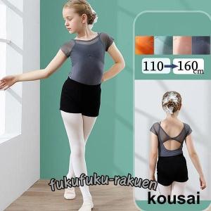 バレエレオタード キッズダンス キッズレオタード 子供ダンス衣装 バレエダンス 2点セット 半袖 透け感 ハーフパンツ 新体操 股下スナップ 女の子 可愛い ダンス