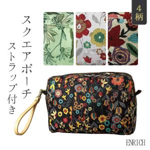 スクエアポーチ ストラップ付き メイクポーチ 化粧品 収納 小物入れ グリーン /ブラック/ホワイト/ブロッサム 花柄 enrich スパイス SRLK1930