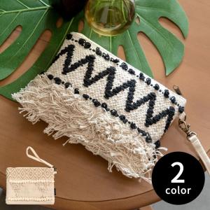 ポーチ クラッチバッグ ストラップ付き フリンジ コットン ホワイト ブラック BOHO ボーホースタイル おしゃれ 90026