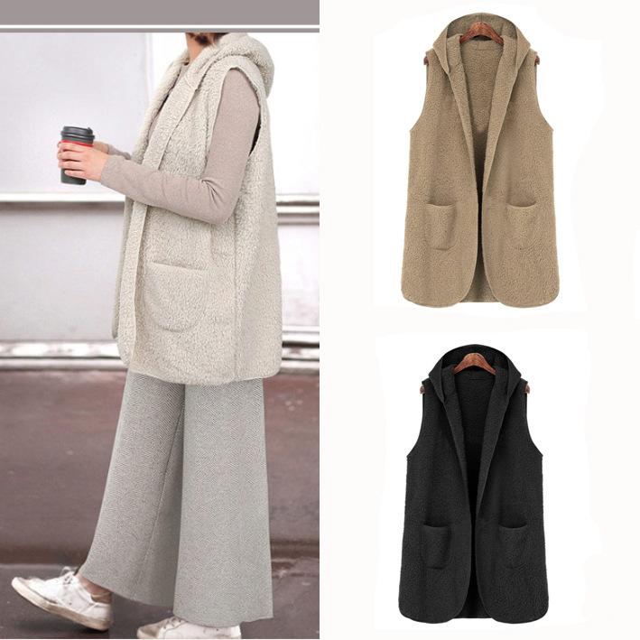 秋冬 レディース ラムウール フード付き 中長 ベスト 両面起毛 大きめサイズ 暖か コート 防寒 軽量 羊毛 加工 切り替え デザイン ハイネック スタイリッシュ 着回し トップス 組み合わせ
