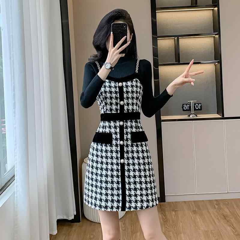 秋冬 レディース ワンピース ニット 2点セット 切り替え シングルボタン 暖か レイヤード 上品 エレガント フェミニン スタイリッシュ 高級感 通勤 デート オフィス