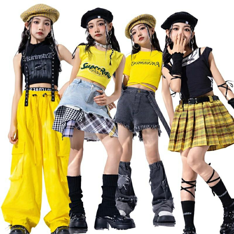 キッズダンス衣装 黄色い 黒 セットアップ キッズ ジャズ チア ダンス衣装 女の子 ヘソ出し 子供服 ヒップホップ スカート パンツ トップス k-pop 衣装 jazz hiphop 演出服 ファッション キッズ 夏 練習着 おしゃれ 単品ORセット
