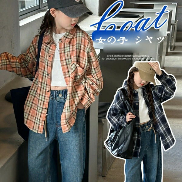韓国子供服 女の子 チェック柄 シャツ カジュアルシャツ 長袖シャツ キッズ 春服 秋服 チェック柄シャツ お出かけ 通学着 春着 秋着 子ども服 ガールズ シャツ ダークブルー オレンジ レジャー デイリー 120 130 140 150 160 170