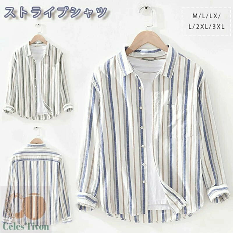 ストライプシャツ メンズ 長袖 カジュアル シャツ 夏 秋 男性用 ジュニア スクール 重ね着 大きいサイズ ワークシャツ ミリタリー 折り