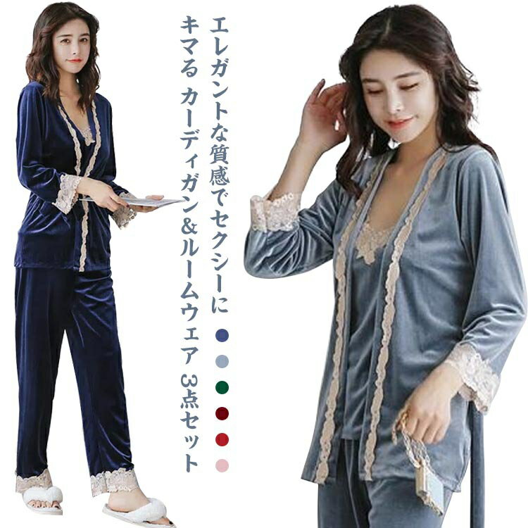 ルームウェア レディース 大人可愛い 春 夏 秋 ベロア風 キャミソール カーディガン パンツ リボン 上下セット 姫系 パジャマ 寝間着 部屋着
