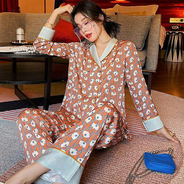 パジャマ レディース サテン ルームウェア 春 夏 長袖 ロングパンツ カジュアル 前開き ナイトウェア 部屋着 おしゃれ 上下セット シルクタッチ 吸湿 通気
