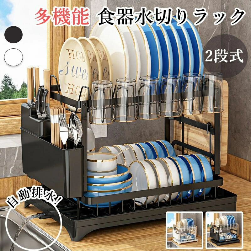 多機能 食器水切りラック 水切りかご 2段式 食器乾燥ラック シンク上 食器 2段式水切りラック 組み立て簡単 省スペース ブラック 箸立て コップ立て まな板立て 包丁スタンド 収納 大容量 自動排水 錆びない 台所用品 ホルダ キッチン収納棚