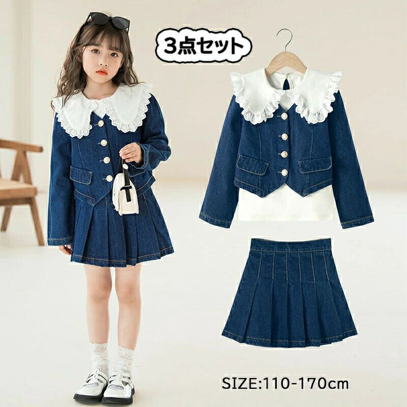 女の子 シャツ スカート ジャケット 3点セット 子供 ブラウス 上下セット セットアップ 子供服 スカートスーツ キッズ ガールズ デニム カジュアル ジュニア 長袖 春秋