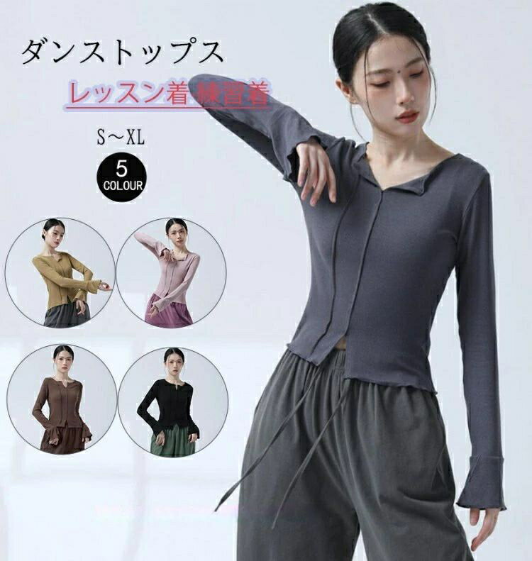 レディースダンス衣装 長袖Tシャツ フレア袖 ブラウス Vネック スリット入り ダンストップス ヨガトップス ヨガウェア 細見え ストレッチ リラックスヨガ 団体服 練習着 レッスン着