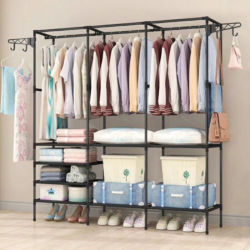 ハンガーラック ワードローブ パイプハンガー 洋服掛け 大容量 収納ラック 組立品 スタイルハンガー 金属製ハンガーレール、頑丈なハンガーコートラックスタンド、屋内用サイドフック付き4層収納棚、フロアコートラック、寝室用縦型ハンガーラック、廊下バッグラック
