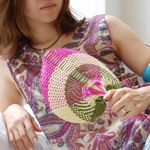 アジアン雑貨 パンダン製カラフルなうちわ ピンク色 8722