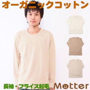 メンズ 肌着 長袖 丸首 綿 オーガニックコットン 秋冬 cotton 暖かい フライス起毛 長袖Tシャツ 白 茶 ボーダー S M L LL