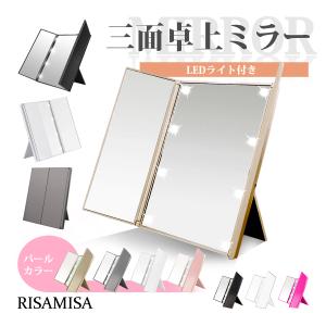 三面鏡 ミラー 卓上 黒 白 ピンク ローズゴールド パール シルバー シャンパン 女優ミラー 鏡 ライト led かわいい 化粧 折りたたみ 携帯 コンパクト コスメ