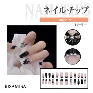 ネイルチップ 付け爪 チップ ロング 24枚セット グルー付 3Dアート パール ブラック ピンク リボン 時短ネイル 貼るネイル セルフ 手の爪 つけ爪 初心者
