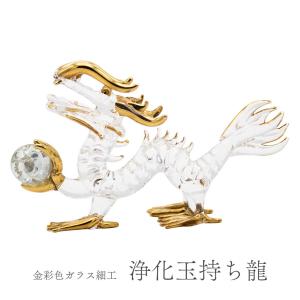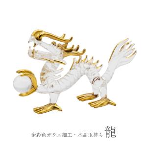 龍の置物 ガラス細工 水晶丸玉付き 風水 縁起物 金彩色 浄化 天然石 玄関 竜 鏡 開運グッズ ドラゴン インテリア プレゼント