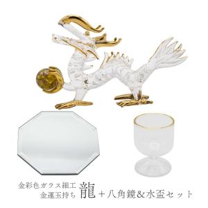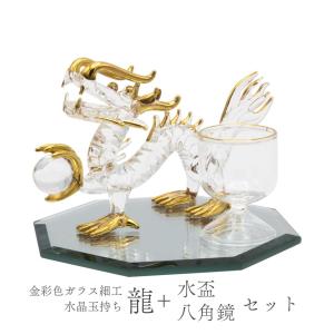 龍の置物 ガラス細工 水晶丸玉付き 八角鏡 水盃セット 風水 縁起物 金彩色 浄化 天然石 玄関 竜 鏡 開運グッズ インテリア