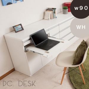 PCデスク 幅約90 ホワイト 木製 おしゃれ 日本製 完成品 キャビネットデスク フルスライド棚 パソコンデスク 収納 リビング ダイニング 敬老の日