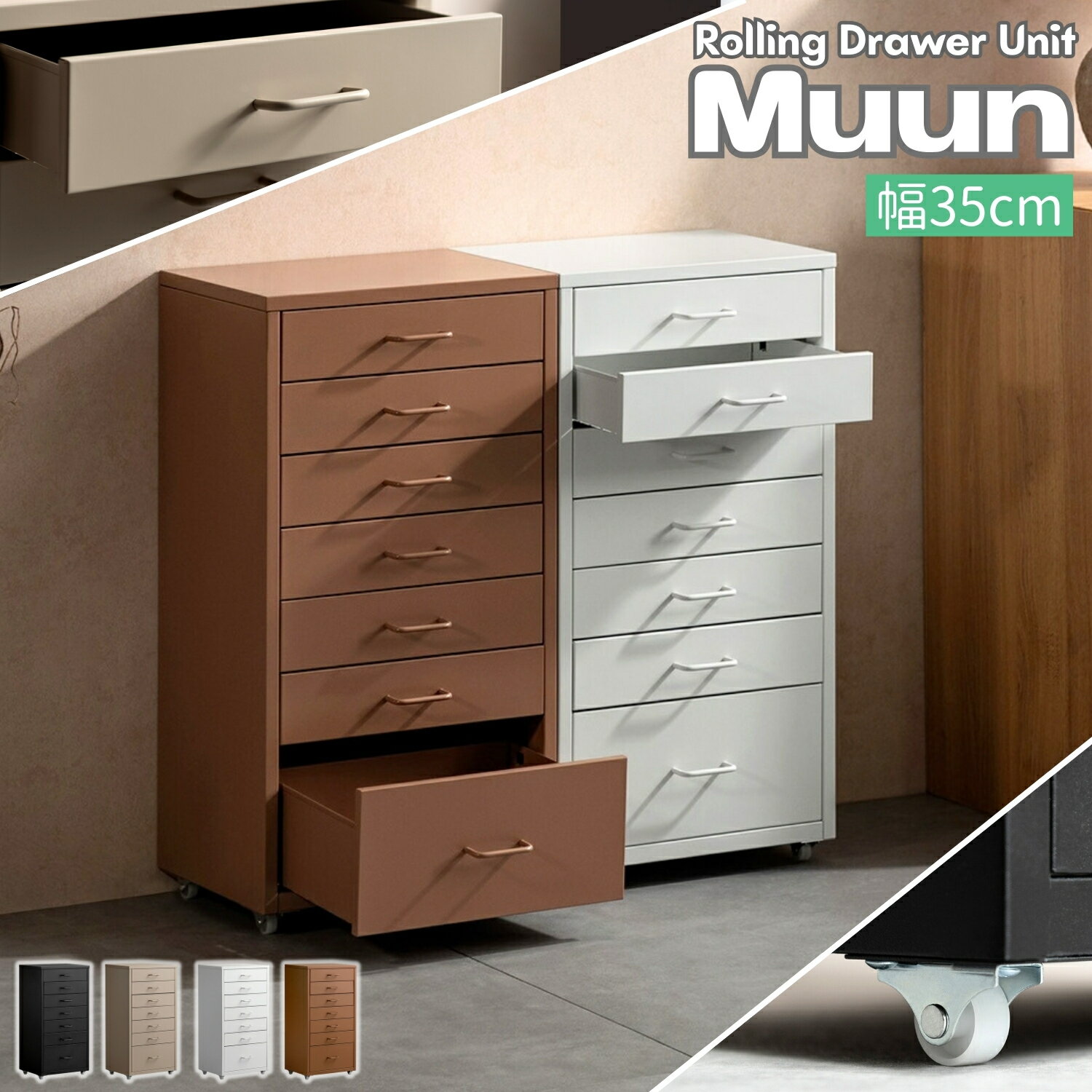 引き出し 収納 幅35cm キャスター付き スチール シンプル ミニマル デスク横 事務所 書類棚 文房具入れ オフィス 書斎 作業部屋 ベージュ/ホワイト/ブラック/ブラウン(コーラルピンク) 白 黒 茶色 小物入れ スタイリッシュ 【Muun】