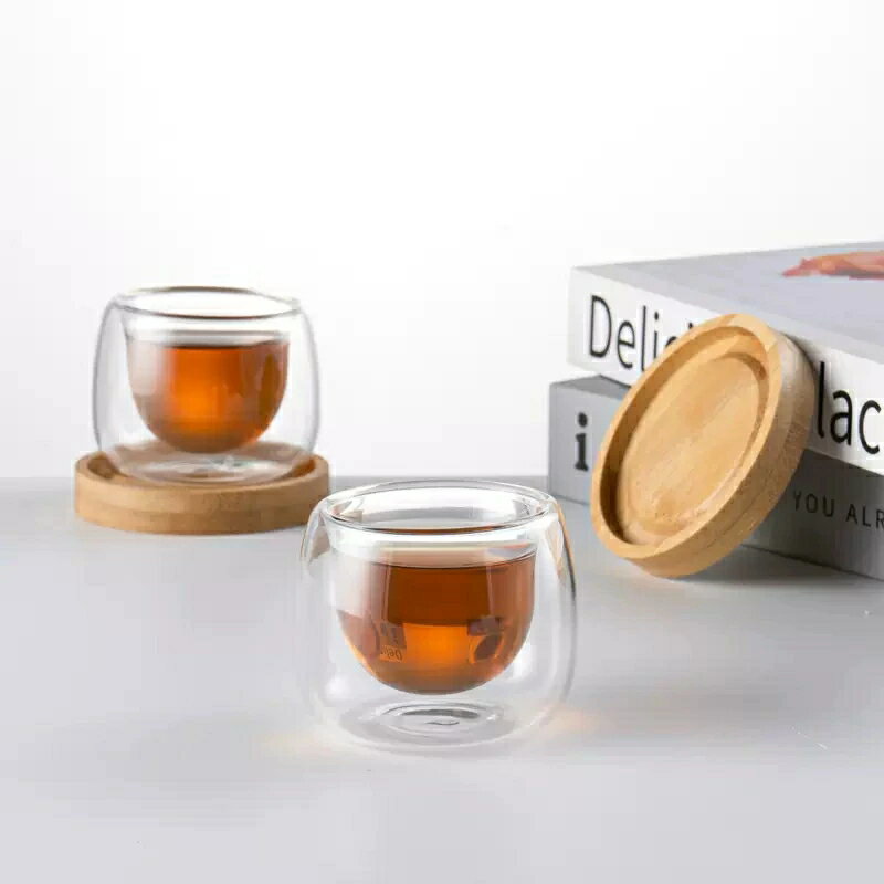 無くなり次第終了!在庫処分!ソーサー付き ダブルウォールグラス 耐熱ガラス グラス 50ml ガラス製 2層硝子 アミューズカップ小鉢 ノンスリップ ガラスコップ おしゃれ 木製 コースター 冷茶グラス カップ 湯呑み ティーグラス グラス小鉢 結露しにくい