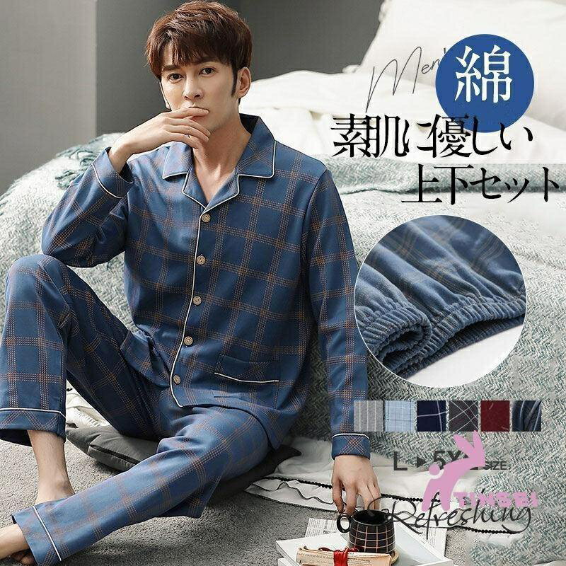 パジャマ メンズ 綿 メンズパジャマ ルームウエア 長袖 前開き 秋 冬 寝巻き 肌触り セットアップ 上下セット 紳士 部屋着 入院 大きいサイズ