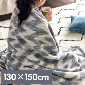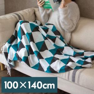 ブランケット ひざ掛け 約130×170cm 膝掛け ニットブランケット 毛布 大判 ブルー ジオメトリック柄 ダイヤモンド柄 肩掛 インド綿 コットン 防寒 a-3440