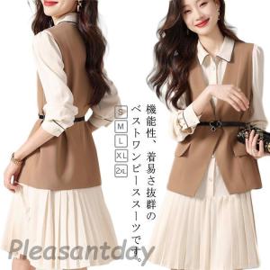 レディース セットアップ ベスト ジレ ワンピース スカートスーツ 春 秋 レイヤード風 重ね着 2点セット 長袖 さらりと心地よい 着痩せ カジュア