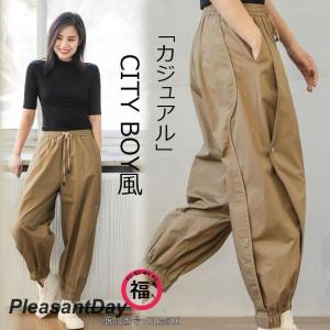 サルエルパンツ テーパードパンツ ボトムス チノパンツ ズボン レディース カジュアル 綿 ポケット付き ゆったり ウエストゴム 無地 カーキ