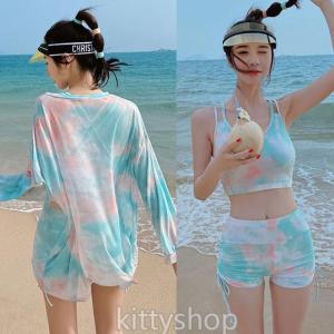 水着 レディース 20代 韓国風 お洒落 水着 体型カバー タンキニ 3点セット 長袖シャツ スイムウェア ショートパンツ ブルー 学生 水着セット