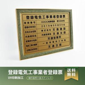 登録電気工事業者登録票 緑/茶の金枠x金ステンレス W572×H421mm 選べる書体 枠 UV印刷 ステンレス 宅建 標識 看板 取引業者 短納期(ele-newGR)