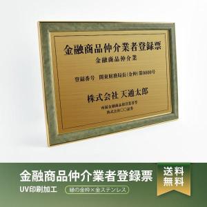 【送料無料】金融商品仲介業者登録票 緑/茶の金枠x金ステンレス W572×H421mm 選べる書体 枠 UV印刷 ステンレス 宅建 標識 看板 取引業者 短納期(fpb-newGR)