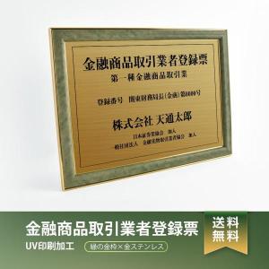 【送料無料】金融商品取引業者登録票 緑/茶の金枠x金ステンレス W572×H421mm 選べる書体 枠 UV印刷 ステンレス 宅建 標識 看板 取引業者 短納期(fpt-newGR)