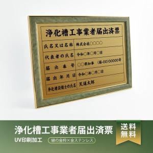 浄化槽工事業者届出済票 緑/茶の金枠x金ステンレス W572×H421mm 選べる書体 枠 UV印刷 ステンレス 宅建 標識 看板 取引業者 短納期(jkssm-newGR)
