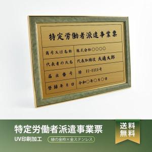 【送料無料】特定労働者派遣事業票 緑/茶の金枠x金ステンレス W572×H421mm 選べる書体 枠 UV印刷 ステンレス 宅建 標識 看板 取引業者 短納期(tkt-newGR)