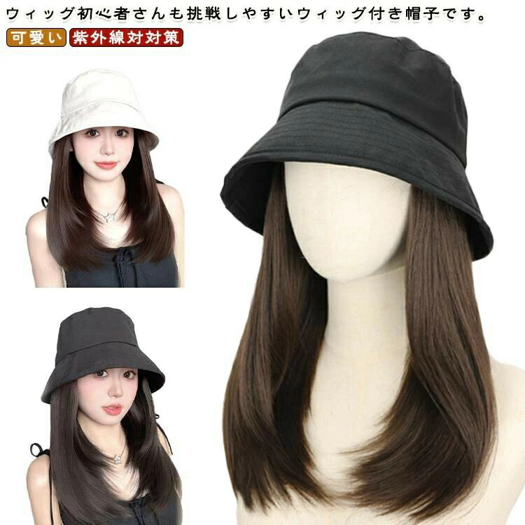 手入れ簡単つけ毛ウィッグ付き一体式ウィッグ付き帽子髪付き帽子バケットハットストレートレディースミディアム可愛いかつら小顔効果日焼け防止旅行用日常用紫外線対対策