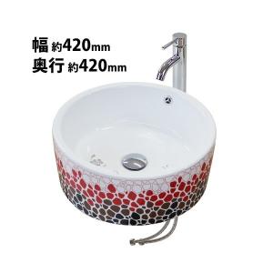 排水栓 手洗器 手洗い器 セラミック 陶器 洗面 トイレ用 タイル柄 赤 花柄 蛇口 置き型 ベッセル型 丸型 円形