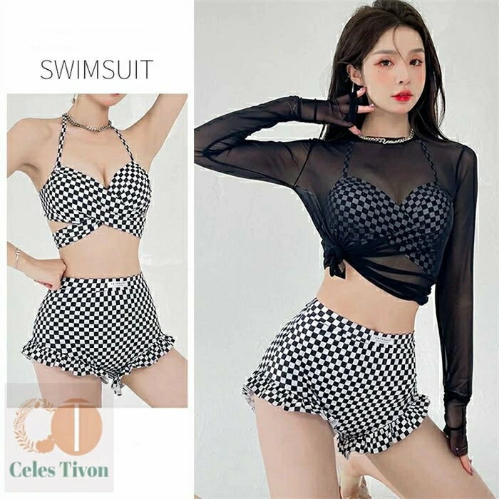 水着 レディース ビキニ 3点セット 千鳥格子柄 カバー カバー付き 可愛い 韓国 上下別 盛れる セクシー ワンピース 旅行 透け感 ビーチウェア 肌守り フレア 体型カバー ショートパンツ クロスデザイン セクシー ぽっちゃり 露出控えめ 小胸 20 30 40 50代