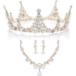クラウンティアラ 3点セット ネックレス ジルコニア ヘアピン付 付け方解説書付き 結婚式 パーティ(ゴールド, フリーサイズ)