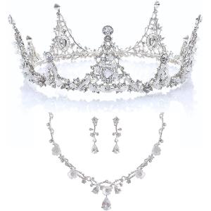 クラウンティアラ 3点セット ネックレス ジルコニア ヘアピン付 付け方解説書付き 結婚式 パーティ(シルバー, フリーサイズ)